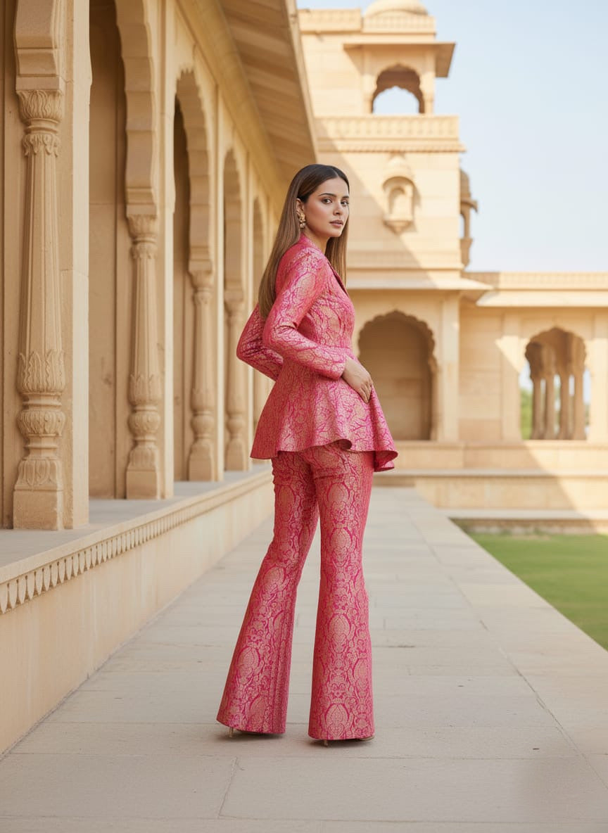 Dazzle like a star at your next celebration with our exquisite Brocade Hot Pink Jacket Cord Set. Step into the spotlight this festive season with our stunning Brocade Hot Pink Jacket Cord Set, inspired by the elegance of Aishwarya Rai Bachchan's wedding reception. Elevate your style and make every moment unforgettable.